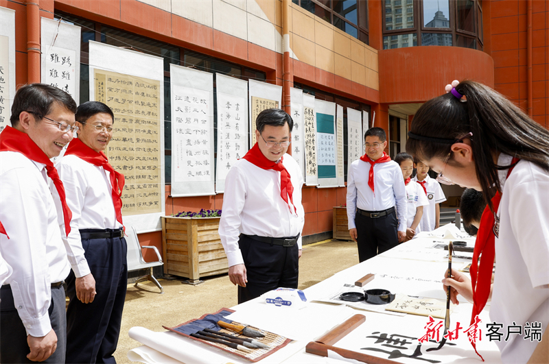 校園里處處洋溢著節(jié)日的氛圍,音樂演奏、拼貼畫制作、書法練習(xí)、科技小發(fā)明等社團(tuán)活動(dòng)豐富多彩,花樣跳繩、傳統(tǒng)武術(shù)、空竹、合唱等節(jié)目精彩紛呈。胡昌升走進(jìn)校園,佩戴上鮮艷的紅領(lǐng)巾,不時(shí)駐足與孩子們互動(dòng)交流,為孩子們的精彩創(chuàng)作和表演點(diǎn)贊。他說,少年兒童是家庭的寄托、社會(huì)的未來,是祖國的花朵、民族的希望,就像晨曦中初升的太陽,充滿朝氣、充滿力量、充滿希望。